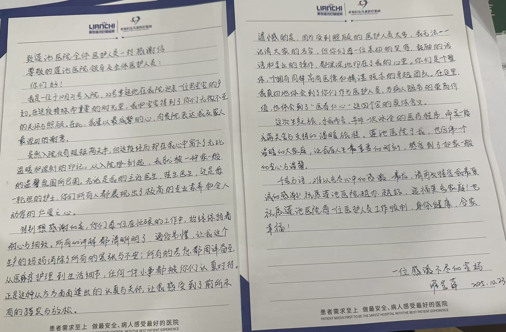 上个月的10月23日,我院收到了一封特殊的“礼物”——来自一位刚生产完的宝妈的手写感谢信。字里行间没有华丽的辞藻,却藏着最真挚的温度,记录下她在莲池两天半的住院时光里,那些被用心呵护的瞬间。