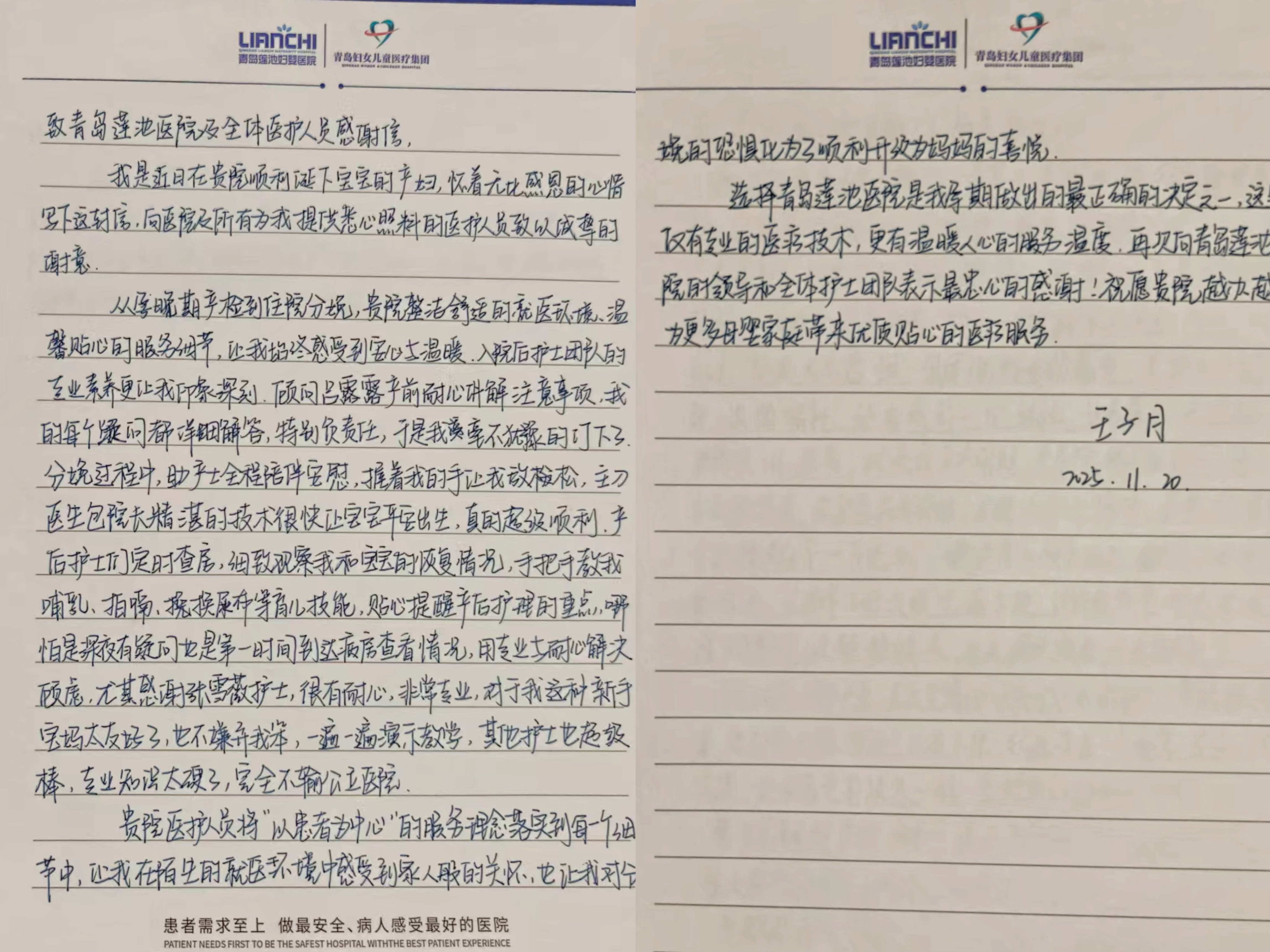 读这封信时,我们的心里满是感动。她口中“手术超级顺利”的背后,是业务院长包蓬勃带领的产科团队无数次的技术打磨;她反复感谢的“手把手教学”,是郭启敏护士长带领的产科护理团队,把每个新手妈妈的慌乱都看在眼里、放在心上;还有吕露露顾问的耐心解答、助产士紧握的双手、深夜病房里及时亮起的灯光……这些被她记在心里的瞬间,正是莲池对“有温度的医疗”最好的注解。