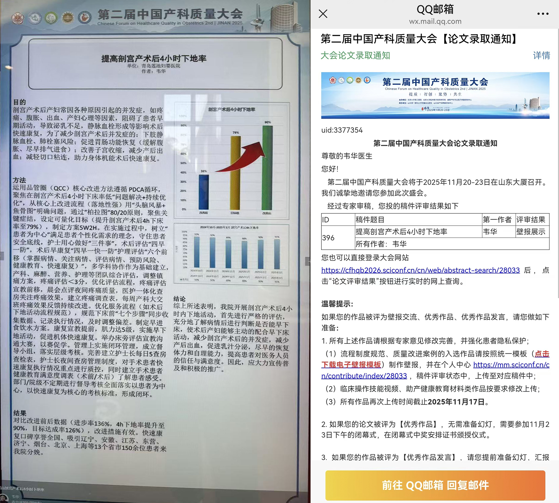 11月20日-23日,第二届中国产科质量大会在山东济南成功举办。本次大会由北京大学第三医院、北京大学临床医学高等研究院、国家产科专业医疗质量控制中心主办,山东第一医科大学附属省立医院、山东省产科质量控制中心承办,聚焦产科医疗质量提升与母婴安全保障,为全国产科同仁搭建了高水平的交流合作平台。由青岛莲池妇婴医院提报的《提高剖宫产术后4小时下地率》项目成果,作为优秀案例在大会现场进行壁报展示,向全国同行分享了医院在产科快速康复领域的创新实践与显著成效。